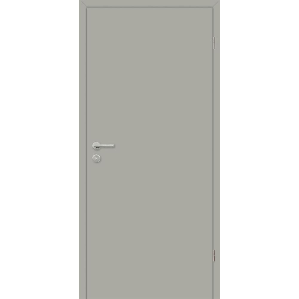 Glatte Innentür mit der Oberfläche Felsgrau, kleiner Rundkante, Bändern V-0020 und BB-Schloss. Alle Angaben in mm.
