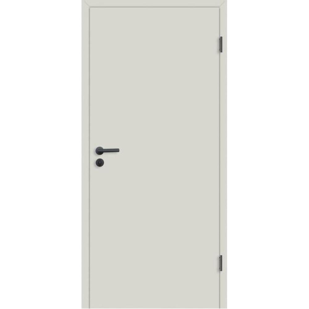 Glatte Innentür mit der Oberfläche Nebelgrau, kleiner Rundkante, Bändern V-0020 und BB-Schloss. Alle Angaben in mm.